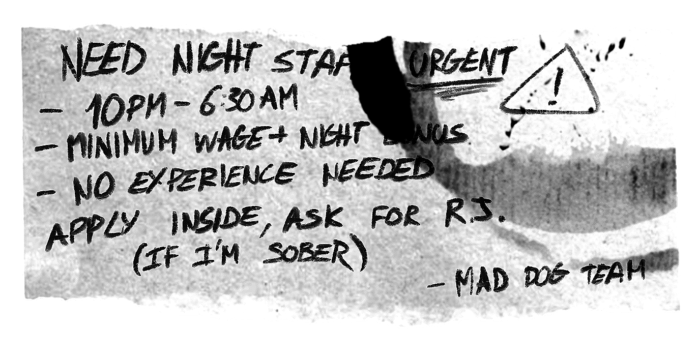 You're a woman working the night shift at the 24/24 Mad Dog Convenience store in the U.S, in the year 2009. You're trying to survive. Pay rent. Stay awake. Pretend your life hasn't stalled.