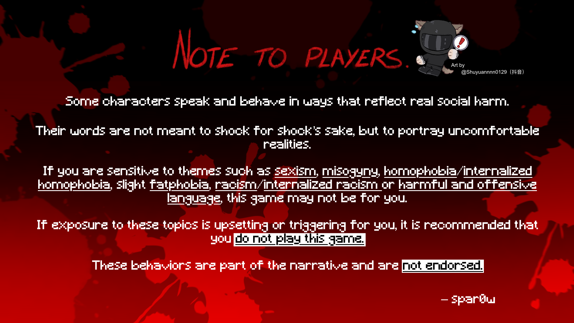 This game contains mature themes, disturbing imagery, and emotional subject matter that may be distressing to some players.